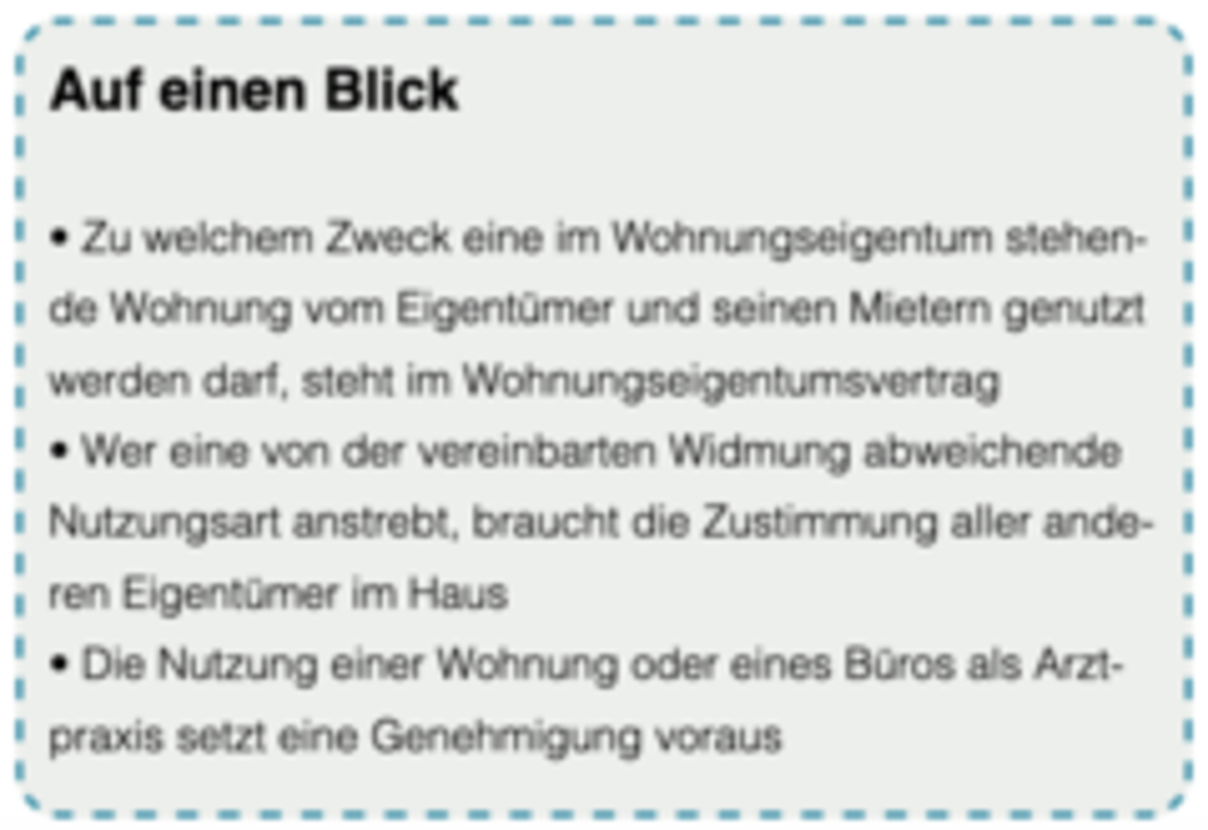 „Wer eine von der vereinbarten Widmung abweichende Nutzungsart anstrebt, braucht gemäß Wohnungseigentumsgesetz (WEG) die Zustimmung aller anderen Eigentümer im Haus“, erläutert Göbel. „Und grundsätzlich setzt die Nutzung einer Wohnung oder eines Büros als Arztpraxis eine Genehmigung voraus.“ Falls die anderen Eigentümer einer Widmungsänderung nicht zustimmen, kann das auch durch einen Gerichtsbeschluss ersetzt werden. Eine wichtige Voraussetzung ist hier, dass die neue Nutzungsart weder eine Schädigung des Hauses verursacht noch die schutzwürdigen Interessen, der anderen Eigentümer beeinträchtigt, noch eine Gefahr für die Sicherheit der Bewohner oder des Hauses bedeutet. „Wichtig ist, dass infolge der Umwidmung zu einer Ordination die anderen Eigentümer nicht durch Lärm, Erschütterungen und Geruch wesentlich beeinträchtigt werden“, bringt es Göbel auf den Punkt.