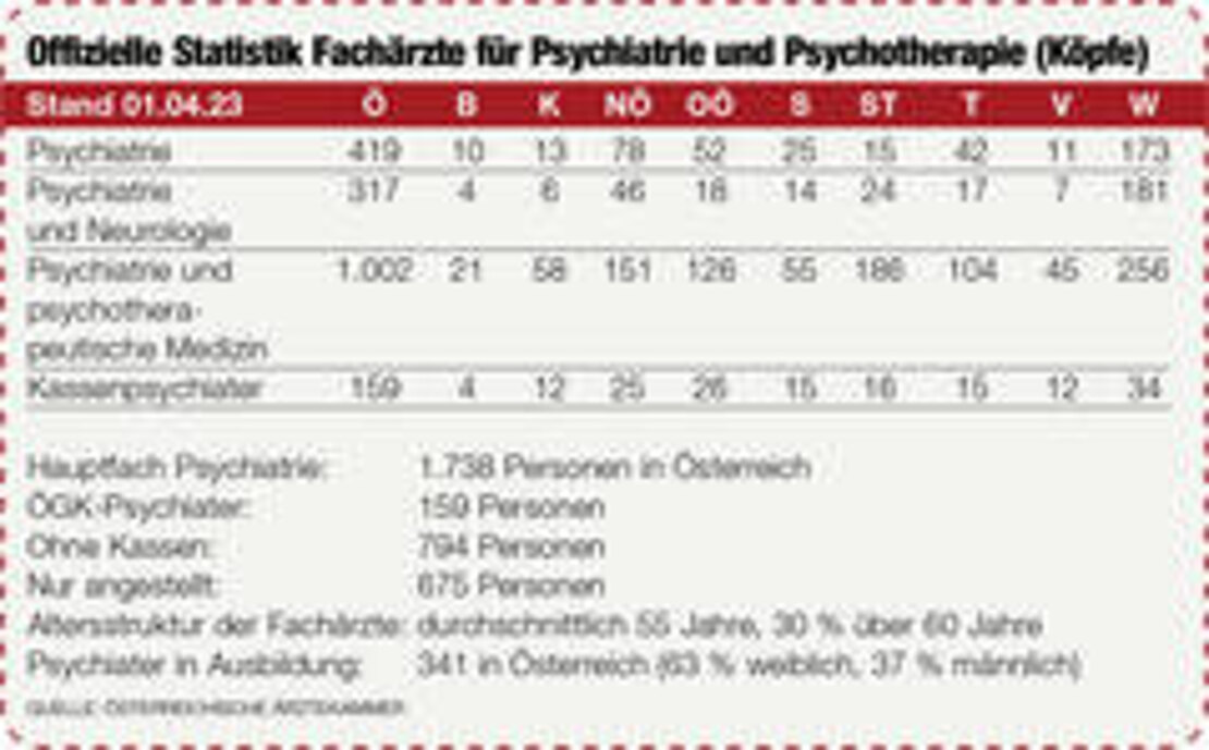 Österreich hat weniger Psychiater für Kinder, Jugendliche und Erwachsene als vergleichbare andere europäische Länder und liegt unter dem Durchschnitt der OECD-Länder, beklagte die Österreichische Gesellschaft für Psychiatrie, Psychotherapie und Psychosomatik (ÖGPP) in einer Stellungnahme zum gravierenden Personalmangel Anfang dieses Jahres.