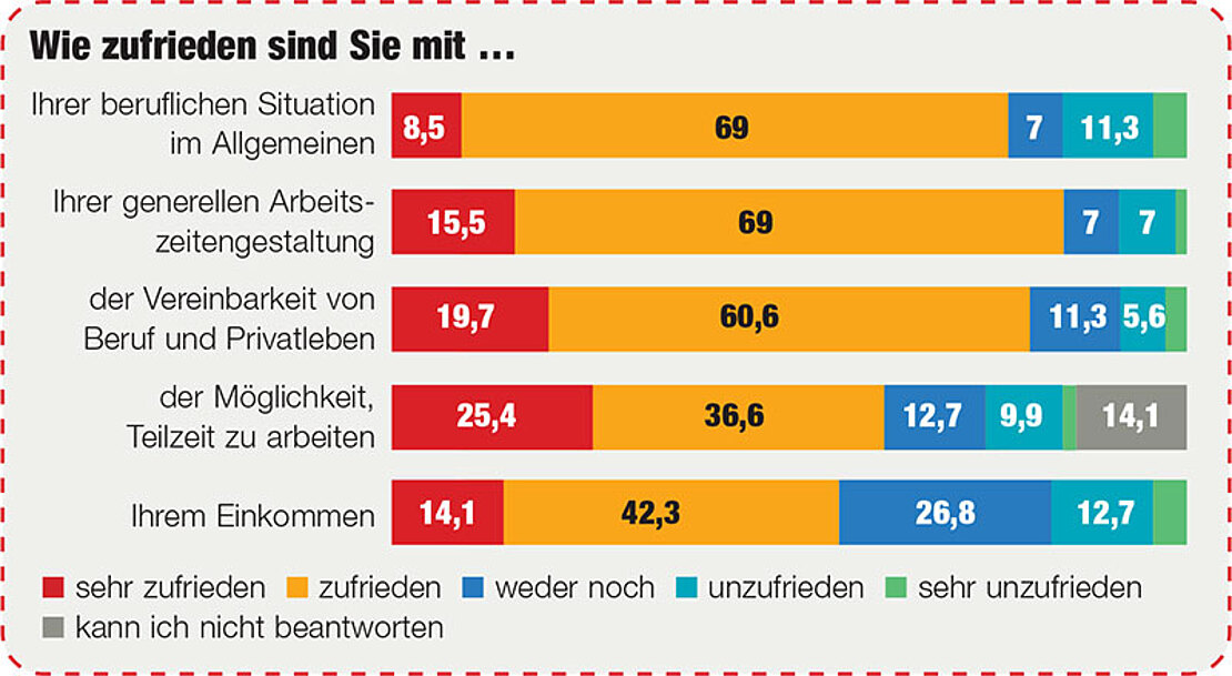 Zum eigentlichen Kernpunkt der Umfrage – der Zufriedenheit am Arbeitsplatz – geben mehr als drei Viertel der befragten Ärzte an, mit ihrer beruflichen Situation und mit ihrer Arbeitszeitgestaltung vor Ort sehr zufrieden bzw. zufrieden zu sein.
