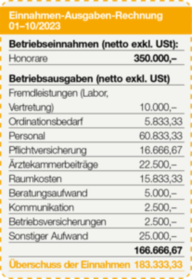 Beispiel: Dr. Rast hat im Zeitraum Jänner bis Oktober 2023 folgendes Ergebnis erwirtschaftet: