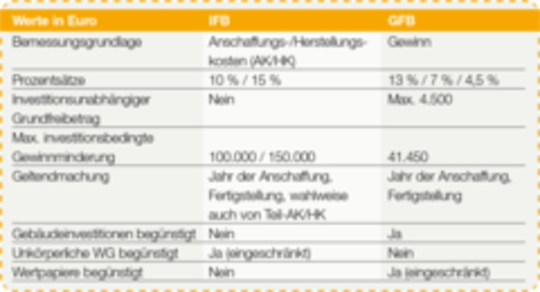 Die Merkmale dieser Güter ähneln stark jenen des IFB, sind jedoch nicht deckungsgleich. Insbesondere zählen auch Wertpapiere zu begünstigten Anschaffungen, die den Voraussetzungen zur Deckung für Pensionsrückstellungen entsprechen. Zum Überblick können die Unterschiede zwischen Gewinnfreibetrag (GFB) und Investitionsfreibetrag (IFB) wie oben dargestellt werden.