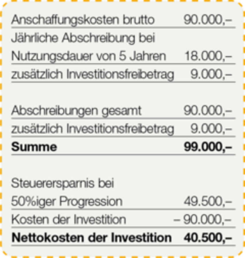 Bespiel: Dr. Rast hat im Mai ein Röntgengerät um 90.000 Euro angeschafft. Die Steuerersparnis durch den IFB errechnet sich wie folgt: