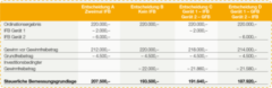 Ist die Ausgangslage nicht so eindeutig, muss die Entscheidung individuell getroffen werden. Wie trickreich der Günstigkeitsvergleich dabei sein kann, zeigt folgendes Beispiel: Dr. Rast erzielt voraussichtlich einen Gewinn von 220.000 Euro. Sie hat ein Gerät mit Anschaffungskosten von 20.000 Euro gekauft, für das sie einen IFB von 10 % in Anspruch nehmen kann. Zusätzlich hat sie eine Anlage zur Stromspeicherung für ihre angemieteten Ordinationsräume mit 40.000 Euro angeschafft, die einen IFB von 15 % ermöglicht. Sie steht nun vor der Wahl (siehe Tabelle 4):