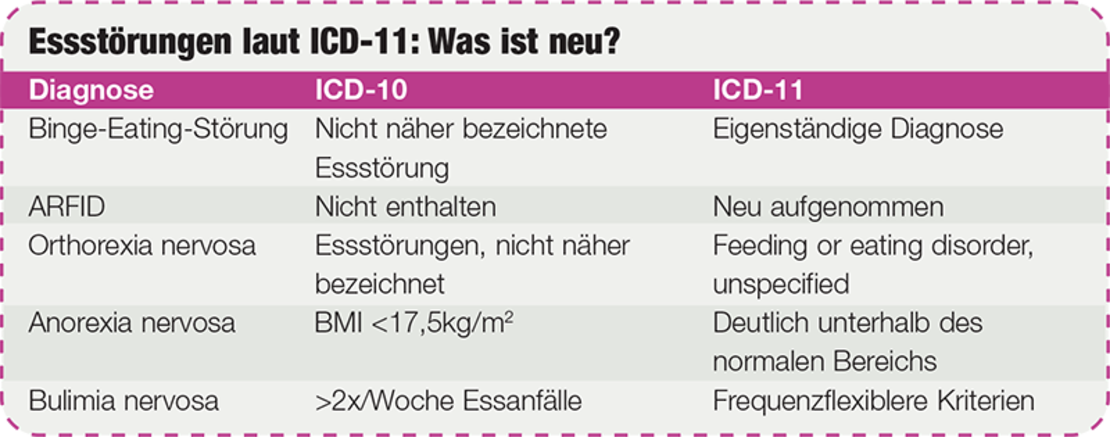 Essstörungen sind schwere psychosomatische Erkrankungen mit Suchtcharakter. Essstörungen sind zudem schwere „Beziehungsstörungen“ mit zugrunde liegenden „Bindungsstörungen“. Nicht das Essen an und für sich ist „gestört“, der Umgang damit ist meist „Mittel zum Zweck“, um die nicht vorhandene „Beziehung“ und „Bindung“ zum eigenen Körper sowie dem eigenen „Selbst“ herzustellen. Diese dysfunktionalen „Bewältigungsstrategien“ gilt es in der psychotherapeutischen Behandlung zu erkennen, zu benennen und schrittweise aufzulösen. Eine genaue Diagnostik am Beginn einer Behandlung ist daher von zentraler Bedeutung. Das ICD-11 liefert hierzu einige bedeutende Neuerungen: