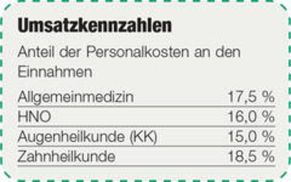 Je nachdem, in welchem Fach ein Arzt tätig ist, kann man sich an folgenden Benchmarks orientieren und prüfen, ob der Anteil der Personalkosten im Vergleich zu den Einnahmen jenem der Kollegen entspricht.