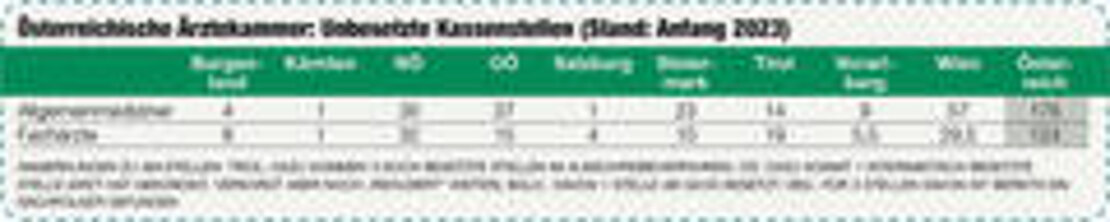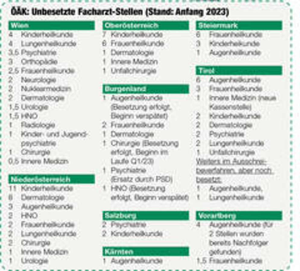 Laut Österreichischer Ärztekammer (siehe Tabellen) fehlen für insgesamt rund 10.170 Kassenplanstellen in ganz Österreich 176 Allgemeinmediziner und 124 Fachärzte, also in Summe gut 300 Ärzte, wobei die Lücken freilich sehr unterschiedlich ausgeprägt sind. Während in Kärnten nur ein Allgemeinmediziner fehlt, sind es in Wien 57. Fachärzte fehlen in Salzburg vier, in Niederösterreich hingegen 32. Besonders prekär ist die Lage bei Augen-, Kinderärzten und Fachärzten für Frauenheilkunde, aber auch Dermatologen, Lungenfachärzte und Psychiater fehlen. Dabei weist Österreich im internationalen Vergleich eine überdurchschnittlich hohe Ärztedichte auf. Sie liegt bei 535 Ärzten pro 100.000 Einwohner und damit an der Spitze Europas vor Norwegen und Spanien, während Ungarn mit 314 Ärzten das Schlusslicht bildet. Der OECD-Durchschnitt liegt bei etwa 350 Ärzten pro 100.000 Einwohner. Laut Ärztekammer wird dabei jedoch nicht berücksichtigt, dass etwa ein Drittel der Ärzte in Österreich nur in Teilzeit beschäftigt ist. Glaubt man den Prognosen für die nächste Zukunft und den Trends unter jungen Menschen in Ausbildung, dann wird dieser Anteil möglicherweise noch weiter steigen. Außerdem werden auch